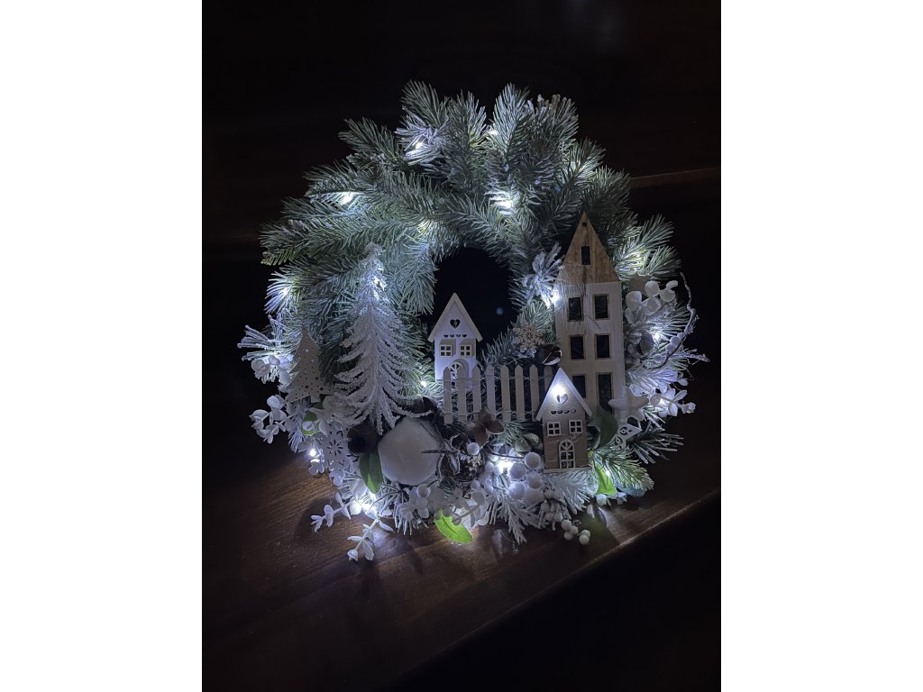 Dominantním prvkem je velká sněhová koule, která dodává věnci hravost a efekt zasněžené zimní krajiny. LED světýlka vytvářejí po rozsvícení hřejivou a útulnou atmosféru – ideální pro dlouhé zimní večery.