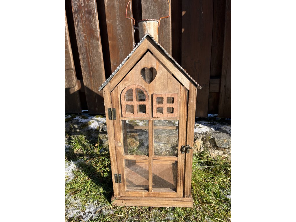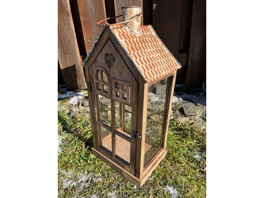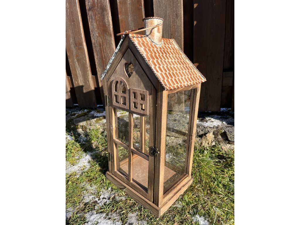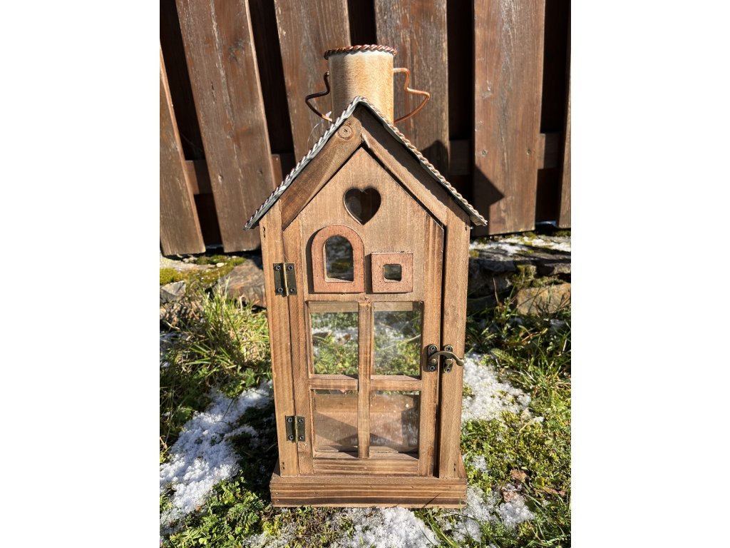 Vytvořte si doma nebo na zahradě příjemnou atmosféru s touto velkou dřevěnou lucernou v elegantním hnědém provedení. Lucerna kombinuje přírodní vzhled dřeva se skleněnými výplněmi a krásnou kovovou střechou, která připomíná orientální styl. Její dekorativní otvor ve tvaru srdíčka dodává celému provedení jemnost a romantický nádech.