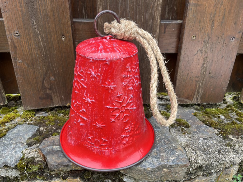 velký kovový zvon, červený vánoční zvon, zvonek s vločkami, kovová vánoční dekorace, závěsný zvoneček na Vánoce