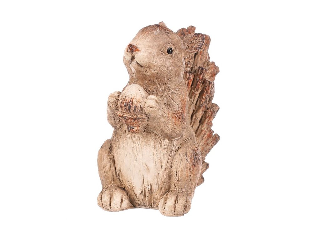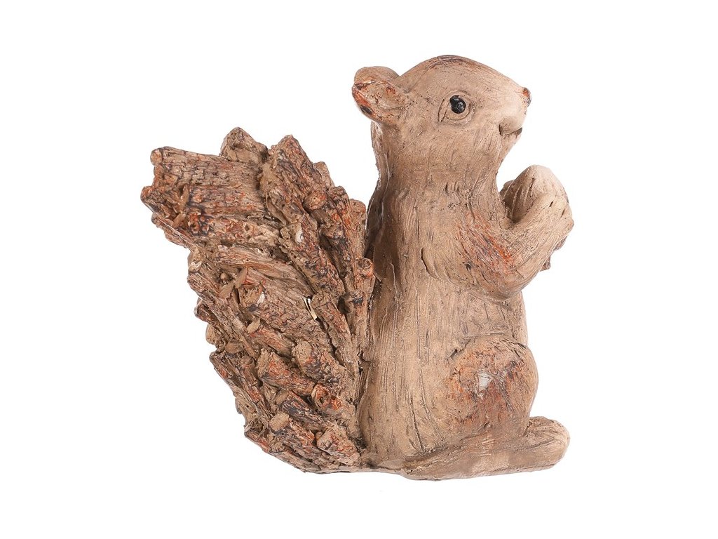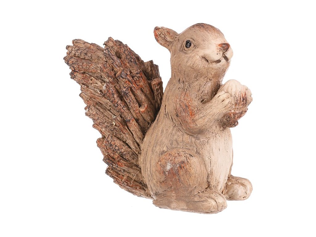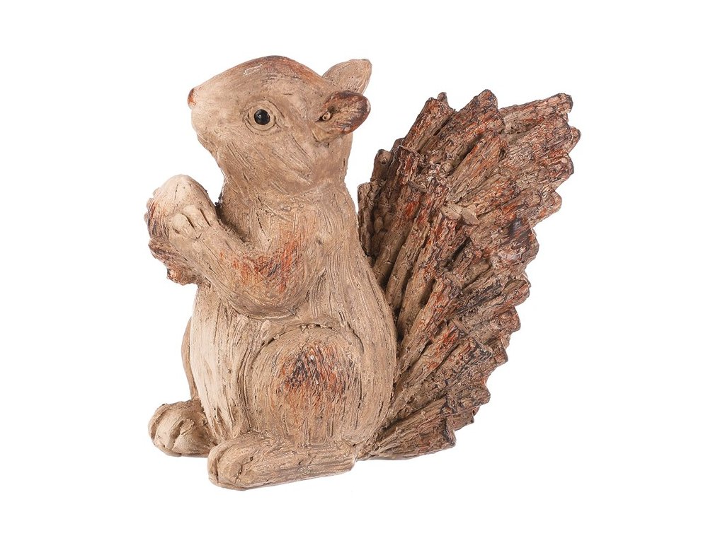 Vytvořte si doma nebo na zahradě kouzelné lesní zákoutí s touto detailně zpracovanou figurkou veverky s oříškem. Roztomilá veverka v béžovo-hnědých odstínech je vyrobena z odolného polyresinu, ale její vzhled imituje přírodní dřevo. Tělo má jemnou dřevěnou texturu a ocásek působí jako ze sekaných větviček, což jí dodává přirozený a rustikální vzhled.