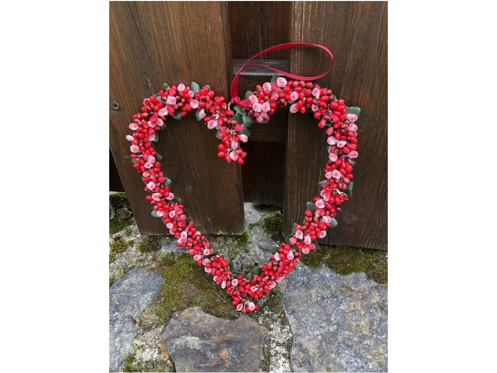 Závěsná dekorace zimní srdce z bobulí v červené barvě