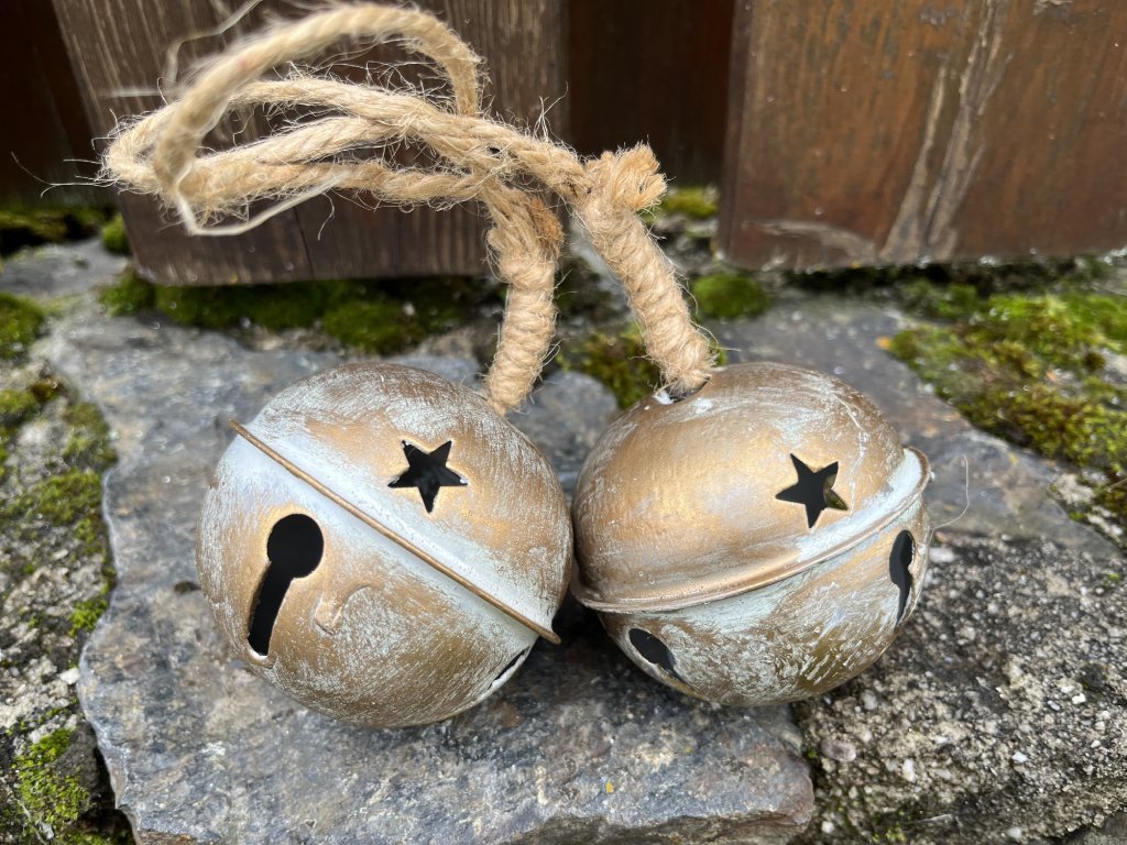 Vánoční dekorace - 2 x stylová kovová rolnička na zavěšení v barvě champagne o rozměrech 8 × 6 cm je krásným doplňkem, který vnese do vašeho domova sváteční kouzlo. Díky zlatému provedení působí luxusně a snadno se kombinuje s dalšími dekoracemi i přírodními materiály.
